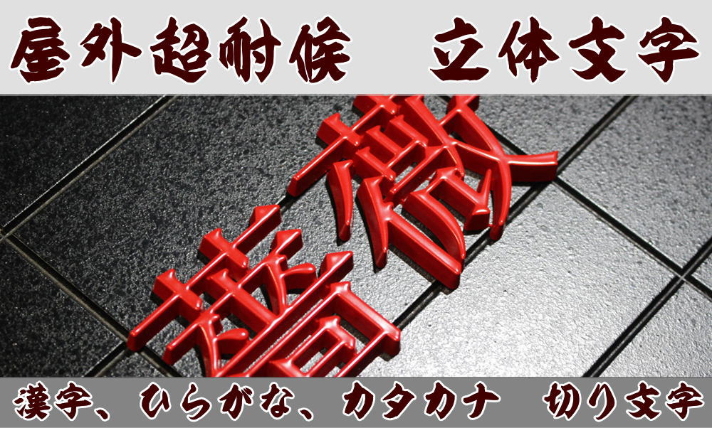 人工大理石をCNCでカッティング。 車両用の塗料で仕上げます。裏面には希望で両面テープを貼って納品です。 人工大理石は熱に強い素材なので屋外でも耐久性に優れます。 切りたい文字などはメールでのやりとりになります。金額は1文字辺りの単価ですので、必要文字数の注文をお願いします。