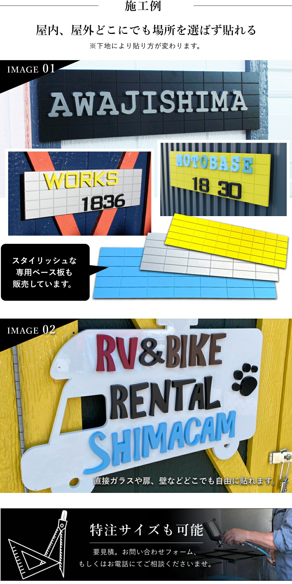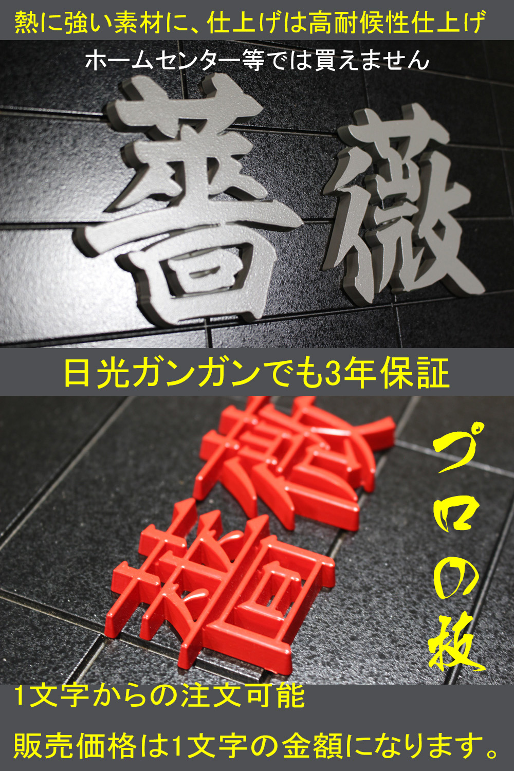 人工大理石をCNCでカッティング。 車両用の塗料で仕上げます。裏面には希望で両面テープを貼って納品です。 人工大理石は熱に強い素材なので屋外でも耐久性に優れます。 切りたい文字などはメールでのやりとりになります。金額は1文字辺りの単価ですので、必要文字数の注文をお願いします。